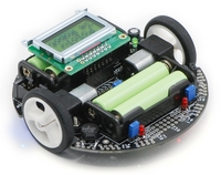 five reflectance sensors, an 8×2 character LCD, a buzzer,
